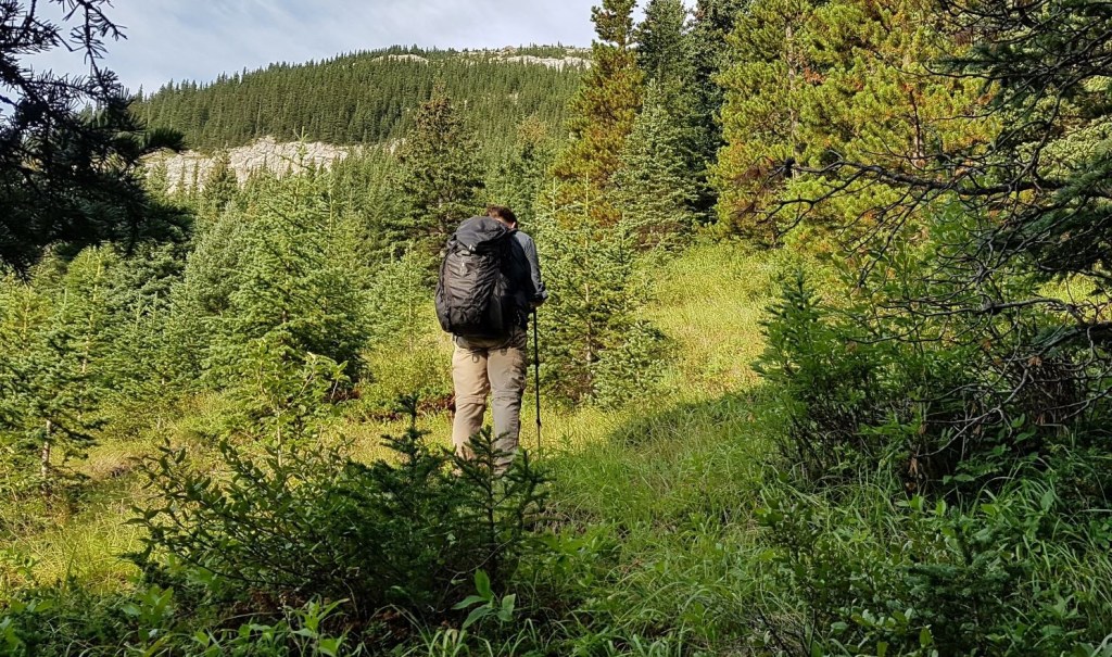 Follow the Gunnery Creek Trail heading north for about 4 km. At around 3 km, Gunnery Creek peters out, but the trail continues through the meadows and into the trees.