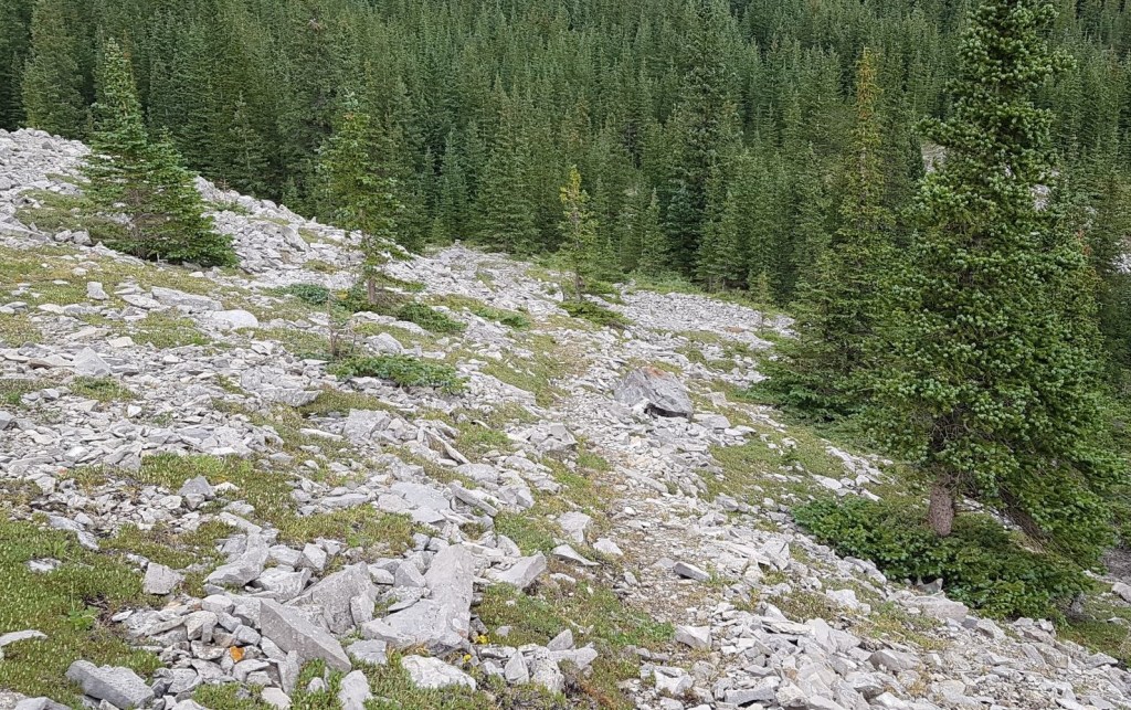 Other than this one rock wall, we headed straight back down to the valley. After meandering through the same washed out braided trail system, we again found the one cairn. We could then easily retrace our steps, and take the trail back up the south flank of Holy Cross Mountain.