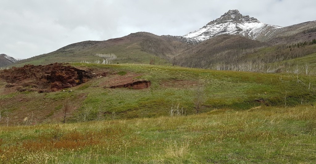 The weather was cloudy and chilly when we started, so we didn’t stop much on the way out. Right: lower flank of Bellevue Hill. Left: Mount Crandell. Middle: Mount Blakiston (I believe). Is it just me? Does the road seem to be trending downward?