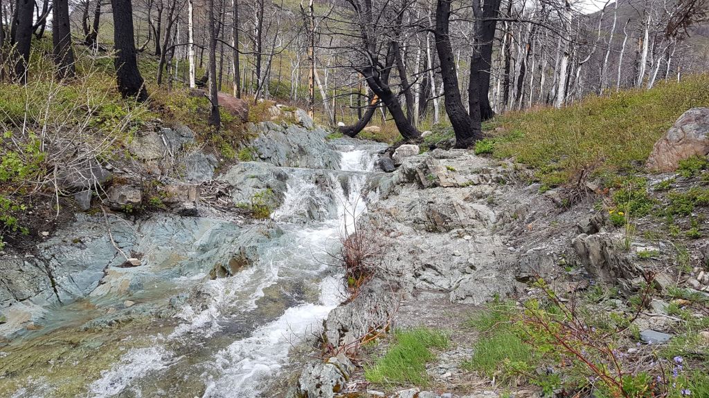 Looking up at Anderson Peak. The forest fires of 2017 are clearly visible.