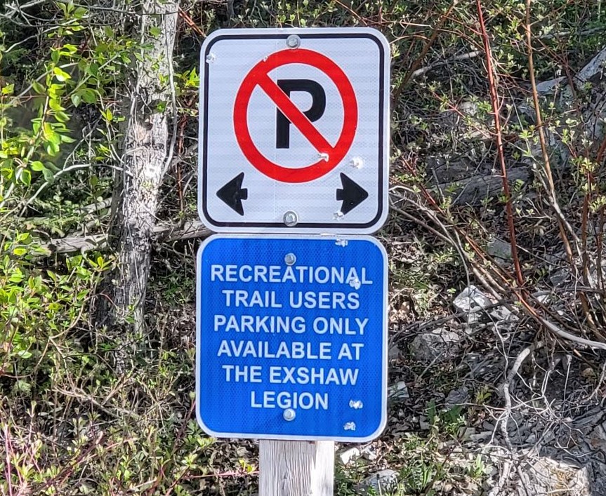 While there is a wide road right next to the trail head that looks like a good parking spot, the town of Exshaw wants you to instead park at the Royal Canadian Legion, right at the entrance to town. Please be respectful of this small community. If the Legion parking is full, then you’ll have to move on and find somewhere else to park and play. Please note that parking on the road is a fine, and this area is patrolled.