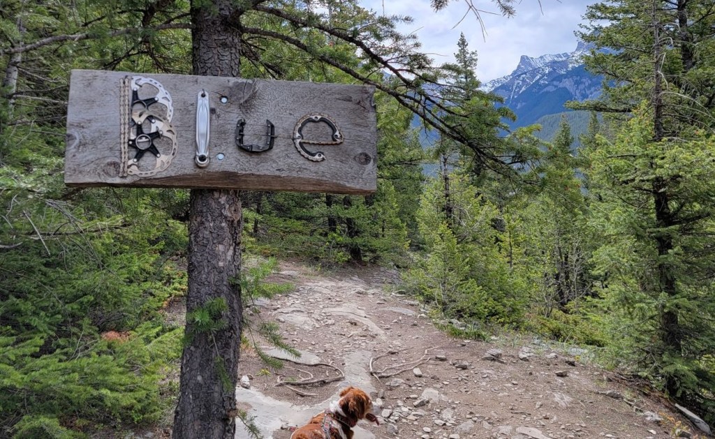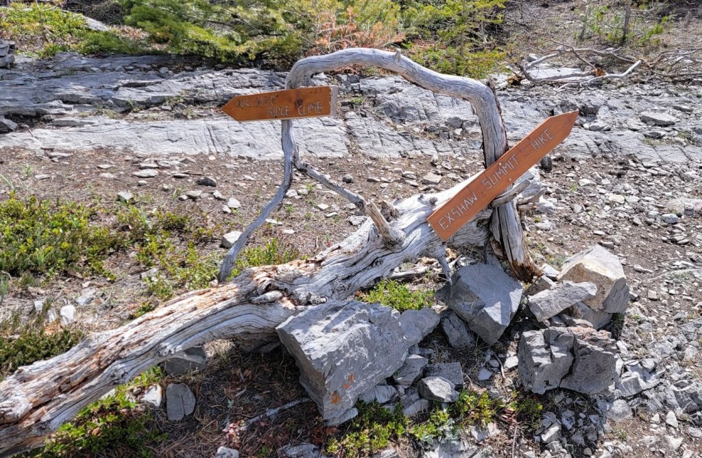 I absolutely love it when people take the time and effort to create in the mountains. Bless you, whoever you are. We had just come from the right – “Exshaw Summit Hike”. The other sign says “Dog Daze Ridge Climb”.