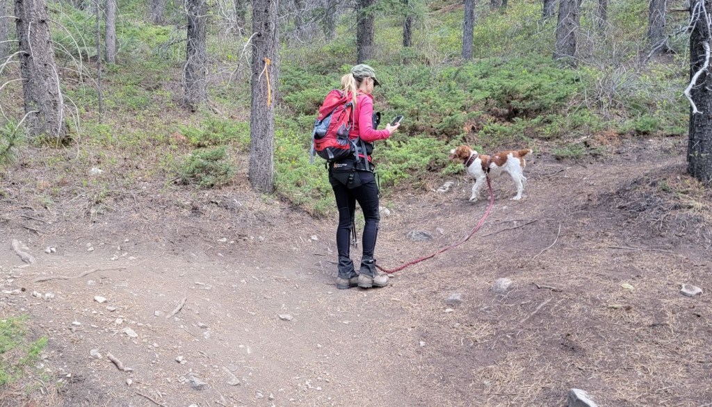 This is Sonya and Pyro coming up from the short ‘down and up’. Beyond this, the trail faded a bit, and I had to backtrack a few meters to pick it up again as the trail made a hard right hand turn.