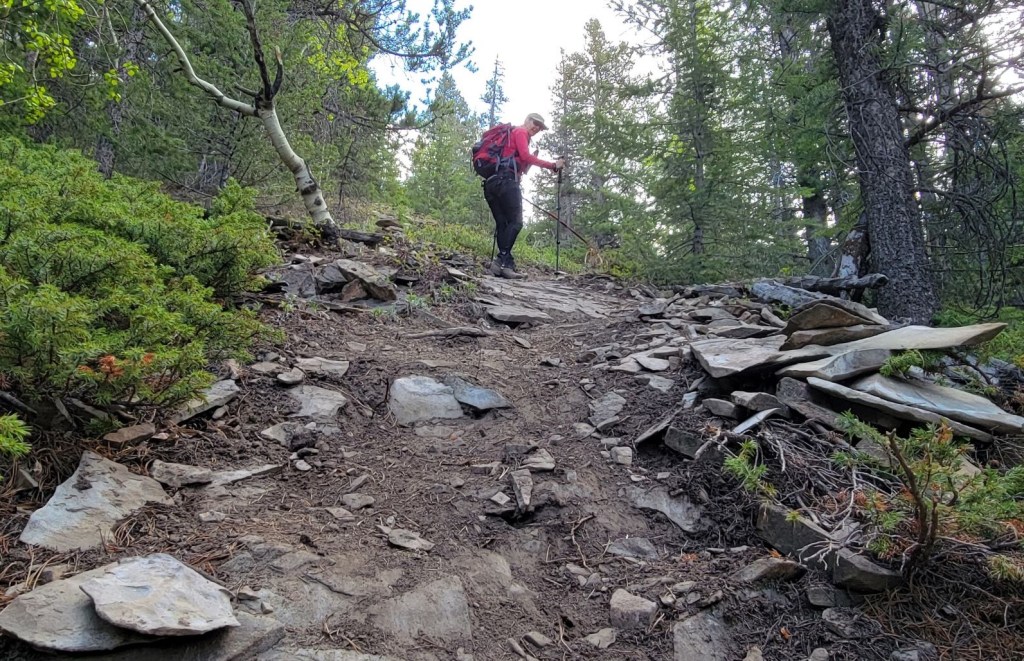 For an unofficial trail, it has cairns at key points or slabs, and carefully placed deadfall kept us on the right track.