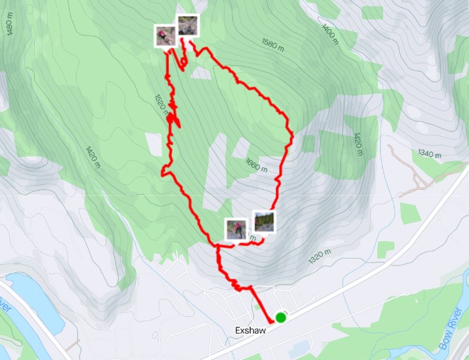 This is the loop of Exshaw Mountain. We took the direct, steep route on the right, and descended the less steep traverse on the left.