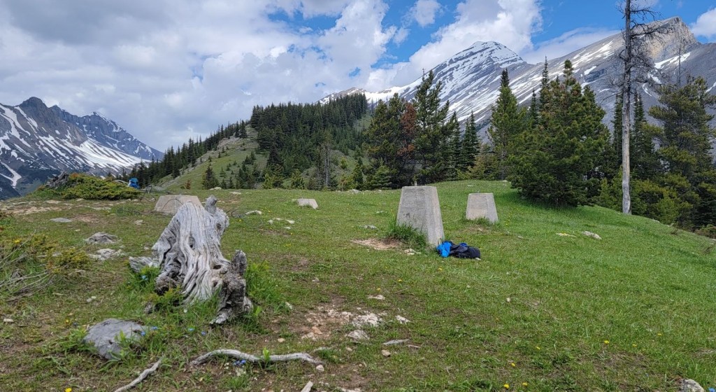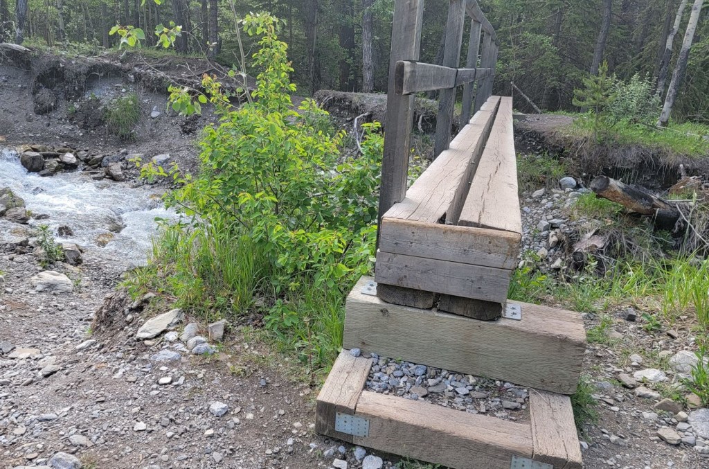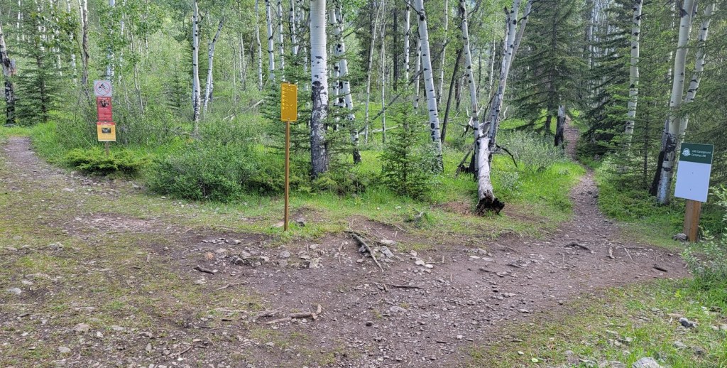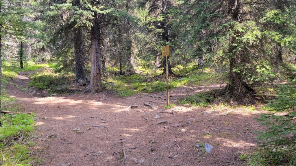 After 8.4 km of hiking, I came to the creek and crossed the bridge. I kept my eyes peeled for the left hand turn to start gaining elevation. I needn’t have worried. It’s about 100 m further along the trail and is a large intersection with the Aylmer Pass (LM8) Campground.