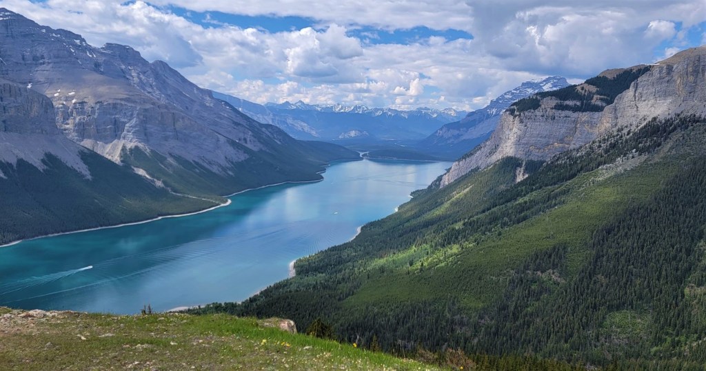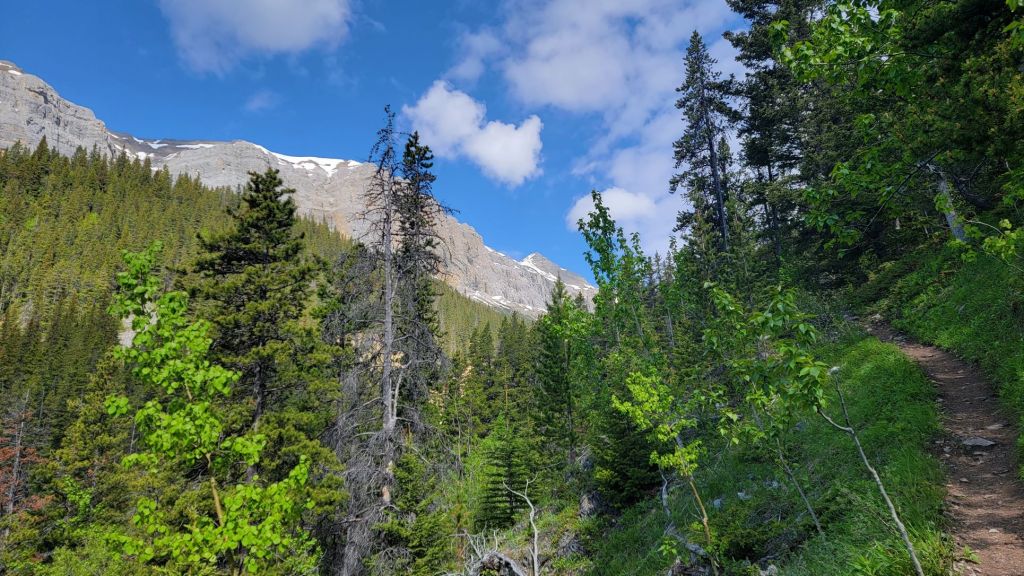 I like to be in the mountains on Fridays to avoid the crowds, and assess conditions for anyone not as fortunate as me to have a flexible schedule. I knew that it was Canada Day and a long weekend, but somehow it didn’t register that it would be busier than usual in the mountains. My first hint was the traffic driving west! It was like a busy Saturday morning. Good thing I left fairly early. When I arrived at the Lake Minnewanka parking lot just after 8:00 am, I had my pick of spots. By the time I returned though, it was a zoo with cars circling.