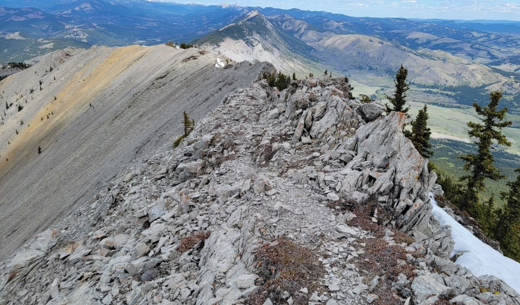 On the final trek to the summit, the wind forced us off the top of the ridge and onto the scree slope to the west, which wasn’t great. Luckily the wind died while we had lunch on the summit, and we could enjoy the nicer ridge top route for the way back down.