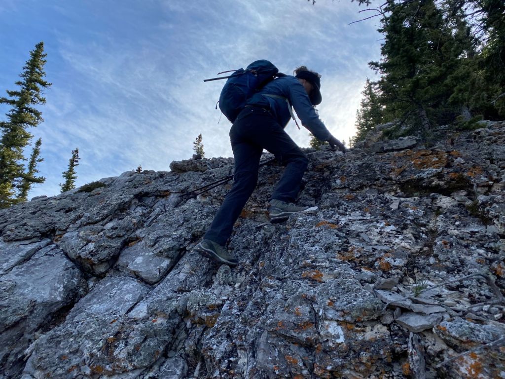 Erin making her way up the final steep section to the summit. The top of the large rock outcrop is just behind Erin’s right hand.