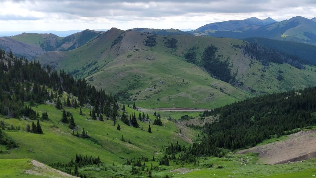 From the embankment, pick up the main trail. It splits at one point, but comes together at a low point. Both work, but I seemed to take the higher trail both times. The trail dips down and follows the creek for a bit, but then climbs back up. When I was here with Sonya in May, the trail was mostly snow covered, and we had a bit of post-holing to contend with. When I came back in July, the snow was gone, but we were treated to a herd of Rocky Mountain Sheep. As this is hunting territory, they were none too pleased to see us, and quickly vacated the area.