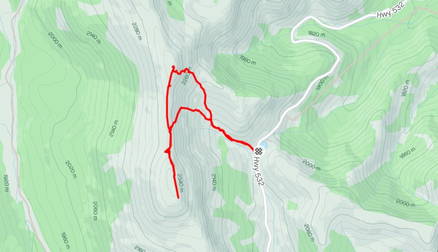 Time to summit of Hailstone Butte was 1 hour. Distance was 1.6 km with an elevation gain of 344 m.