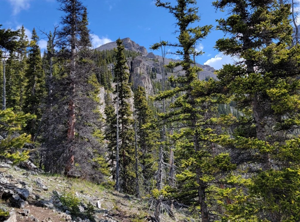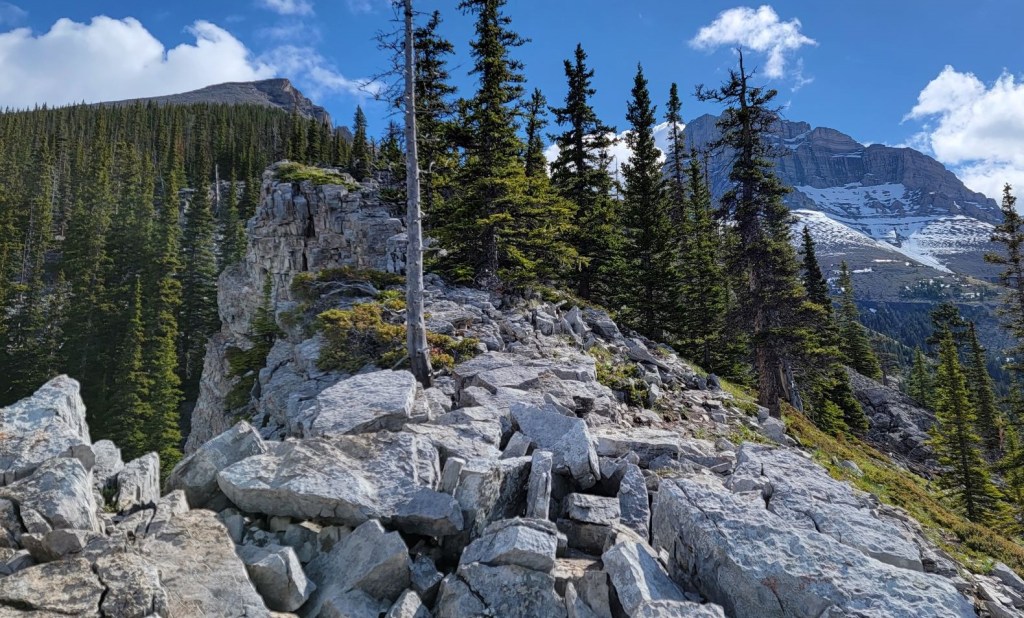 Below the scree and trees, this marks the start of the descent through the lower rocks and boulders.