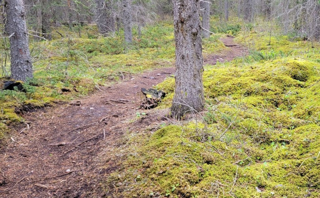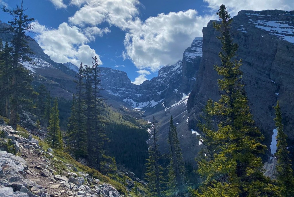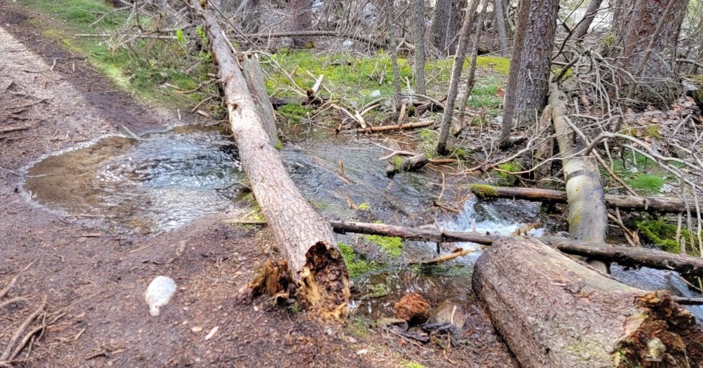 From the Smith Dorrien highway, start hiking up the trail. It’s a lovely forest walk for the first bit. As it was a really late spring, I was careful to pick dry routes. I was then surprised to see the trail was running with water, with parts of the trail blocked with yellow tape. The mystery was soon solved.