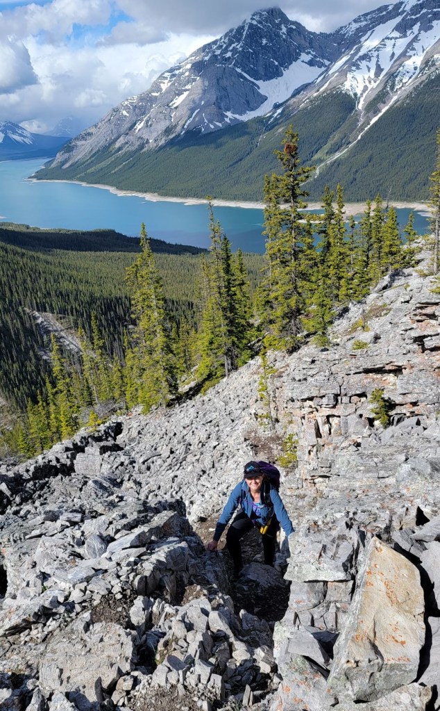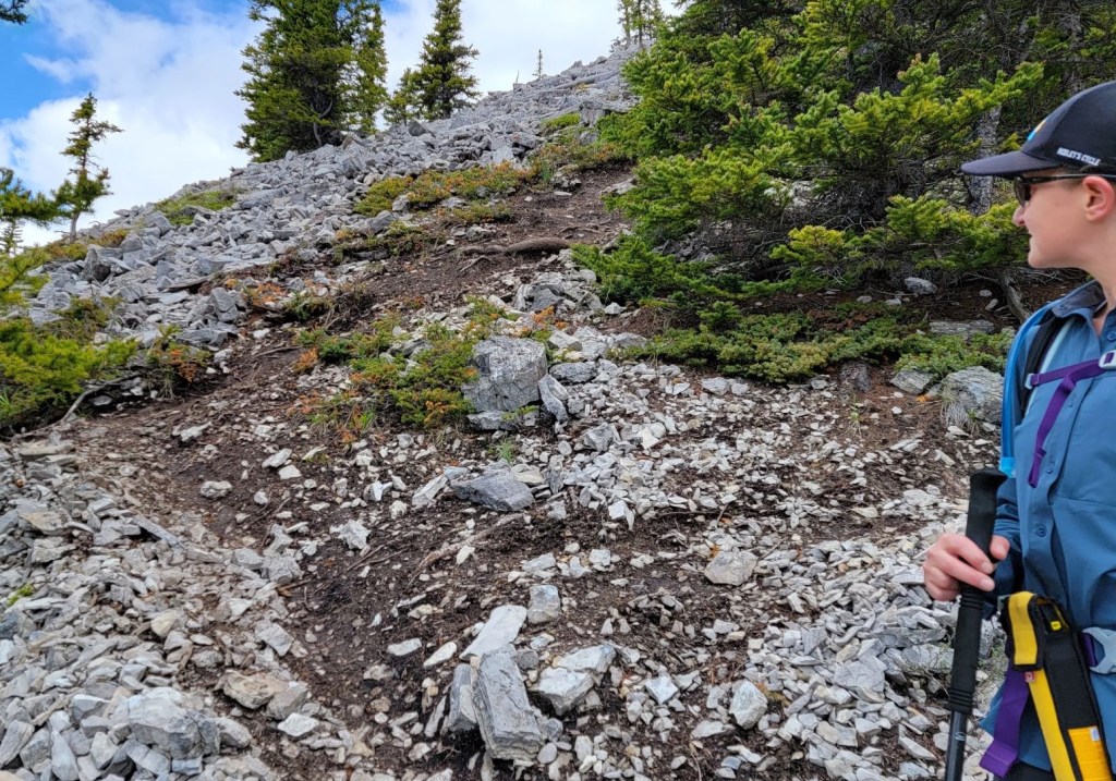 Erin making her way up the trail. Still lots of rocks, with a wee bit of hands on action.