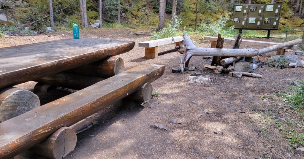 From the Moose Meadows parking lot, hike up the treed trail to the Johnson Canyon T intersection. Go left for the Ink Pots. Hike past the Ink Pots, and cross Johnson Creek at the bridge. Almost immediately, take the left fork to stay on the Johnson Creek Trail. This trail parallels the Creek, and leads straight into Jo9 Larry’s Camp.