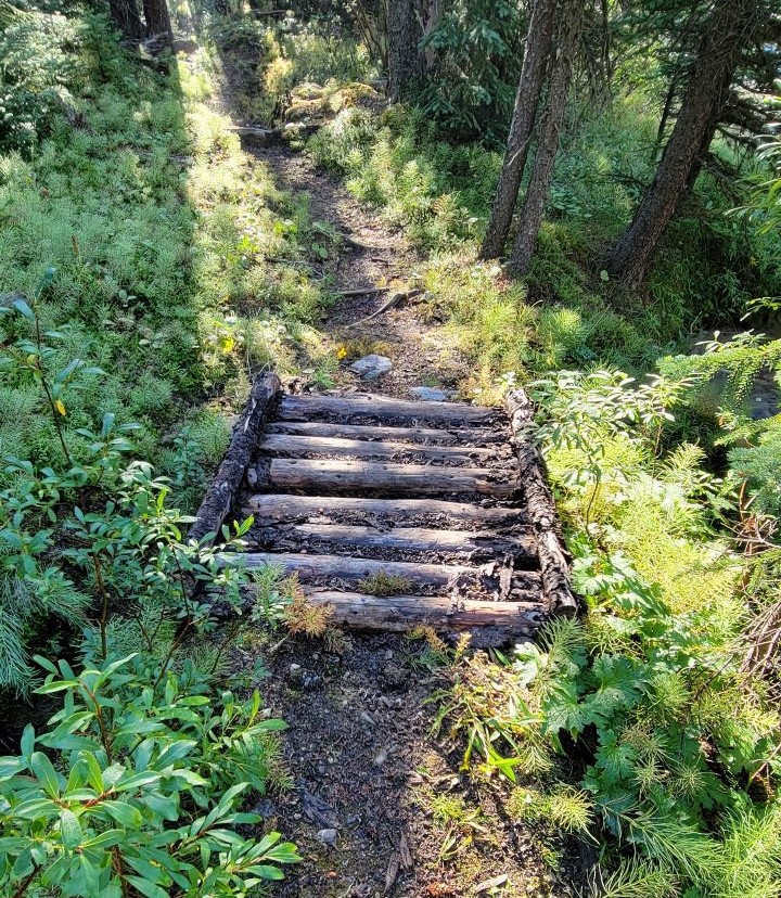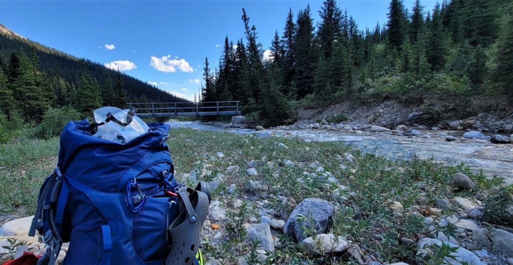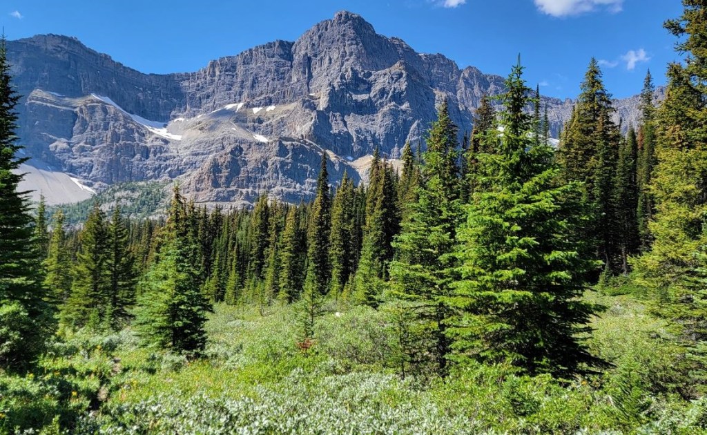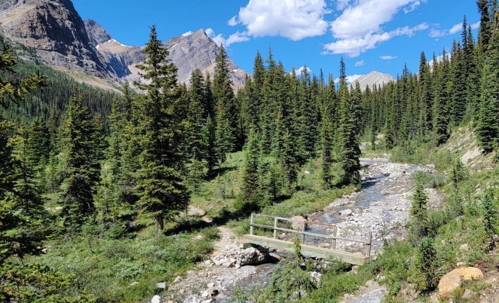 The hike along the Cascade River is about 3.7 km, but it took us longer to traverse due to the washed out trail. We could pick our way along fairly well, but did have to think about several water crossings. Despite the time, I really enjoyed this section. There is just something special about fresh rushing water, especially on a hot day. It’s pretty rare in Alberta, so I enjoyed it immensely.