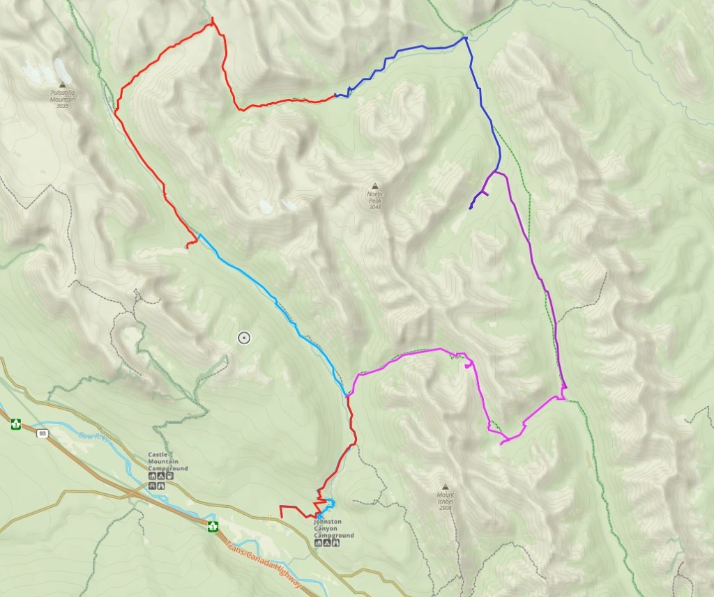 The full circuit took us six days, but it’s possible (preferable?) to have a seventh day. Indeed, we did have a 7th night planned, but we elected to hike 19 km on our final day. The trip starts and ends at the Moose Meadows trailhead off the Bow Valley Parkway, just west of Johnson Canyon. The circuit starts at the Jo9 Larry’s Camp, and loops around to this point, with the return back to Moose Meadows.