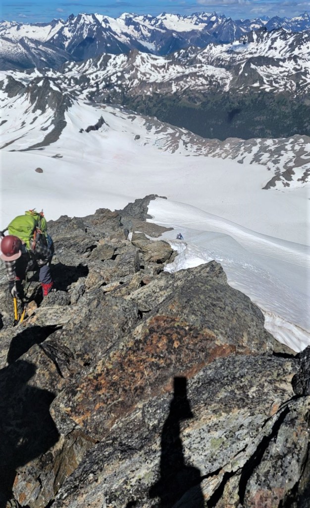Once Chucky was back, we took off the crampons and rope, and scrambled to the summit. The rock was stable and grippy, and it was an enjoyable ascent to the summit of International Mountain.