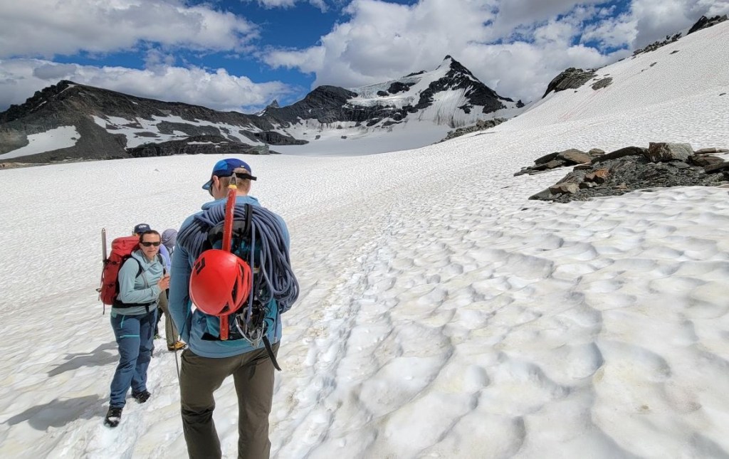 Despite this being one of the longer days, it was so much fun. I was climbing with many people I’d met at previous camps, and everyone was in a great mood. We left camp at 6:50 am, which wasn’t a bit too early due to the intense heat wave. We heard it was over 35 above in Invermere, and we were definitely feeling the heat up here. I was doing the Climb Recap Speech at camp that night, so I was on the lookout for funny stories and situations.