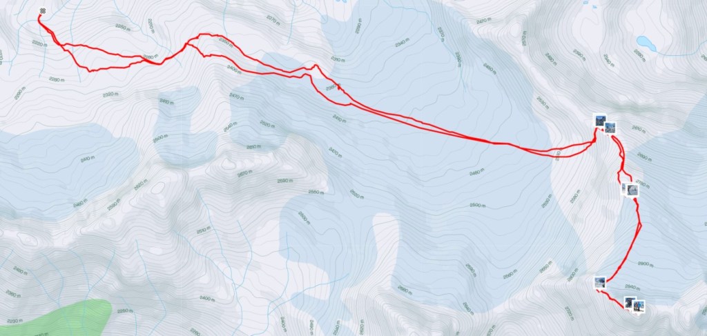This is about 1 km outside of camp. Traversing below Strutt and Sandilands Peaks.