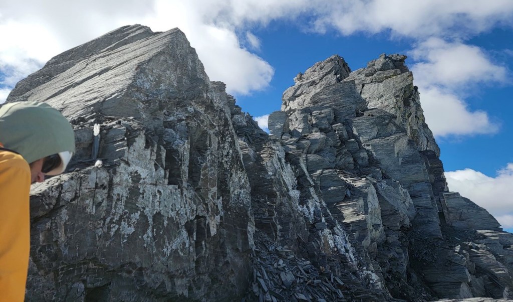 From the col, we scrambled up a bed of churning … rock? It looked like petrified wood, and splintered like wood too. Keith was not happy about this. He’s all about the granite, and prefers his mountains to stay put. I can’t say I blame him, but as a Rockies girl, the constantly shifting scree and boulders is normal. I remember him saying “If this is what Malachite is like, I’m not going.”