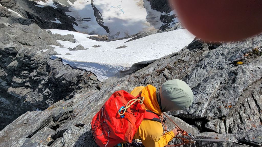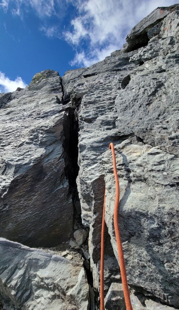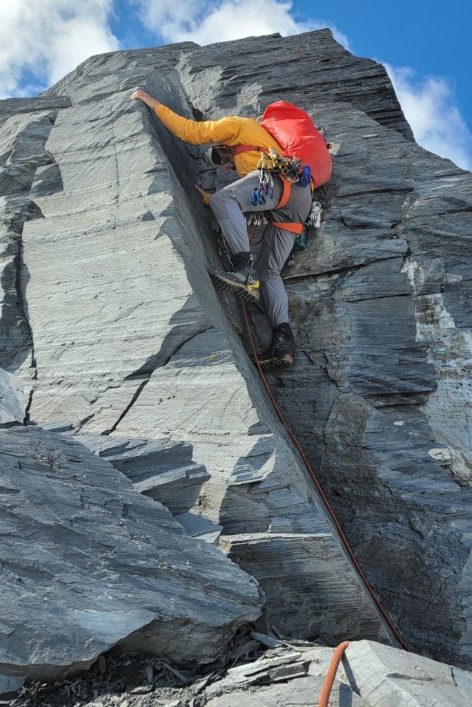 At the base of the climb, the first pitch was a corner. Hamish made quick work of this, and was up in three moves. I know, because I was watching him like a hawk. When it was my turn, I’ll admit that this was just about the end of my day. I could not figure out the first move, which was a lot higher than I thought. After struggling for a few minutes (or so it seemed), I calmed down and gave myself a pep talk. I did NOT just walk 7 km across a glacier to miss out on the climb! I dug deep, figured it out, and got to the top.