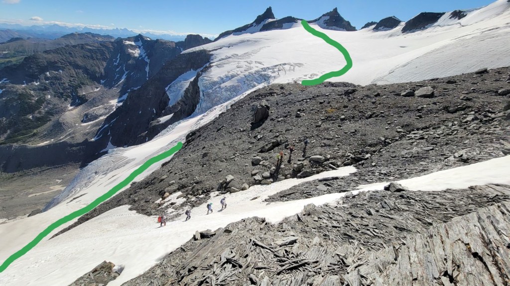 We followed the same route as the International Mountain, by traversing below the Sandilands and Strutt Peaks, across the lower glacier and then hiked up the scree pile to the upper glacier. We donned our crampons, and roped up again to cross the upper glacier. While the International route goes up from here, we stayed lower and continued across the glacier.