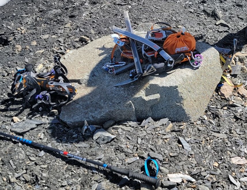 We hiked up to the col between the spires, and got organized for the climbing. We dropped what we didn’t need, while Hamish got busy gearing up.