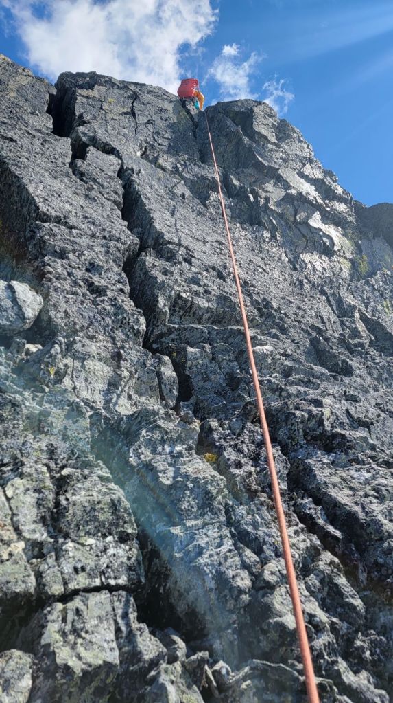 Once at the top of the crack, I climbed up to and around Hamish. I am known to be ‘handsy” and will gladly grab my well anchored partner to make a move. Unfortunately, how Hamish was anchored, and how I had to get around him, I ended up grabbing his inner thigh to climb around him… I am so sorry Hamish. Simon would get a huge laugh out of this story tomorrow on Miners Peak.