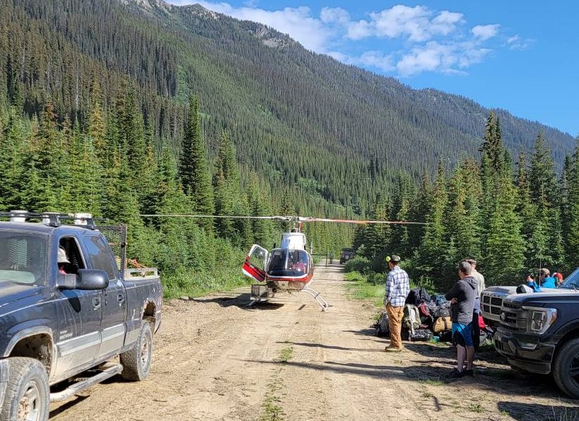 Leader Mike McMinn, Matt, and ACMG Adam holding down bags while the helicopter takes off.