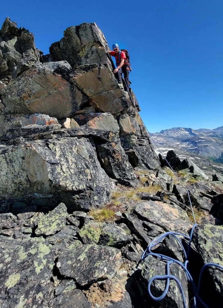 Miners Peak is on the north side of the Bobbie Burns Creek, and is accessed via a gorgeous meadow and rock bands. The climbing consists of several short pitches, with one confidence move across a chasm. It was a fun day with great company. The descent is an awesome trail down the scree on the back side. Want a mellow day? Just hike up the back.