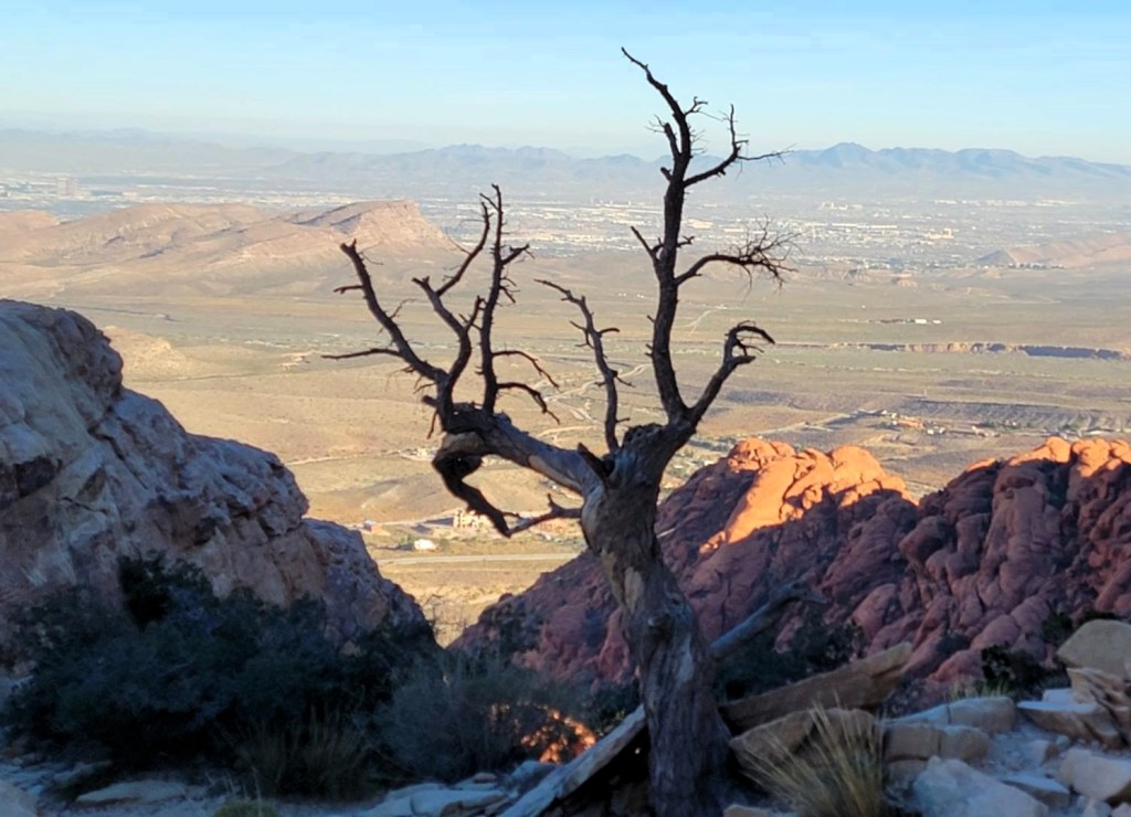We kept hiking past the Calico Tank. There are big boulders here to clamour over, but its worth it for this view of Las Vegas framed by the tree.