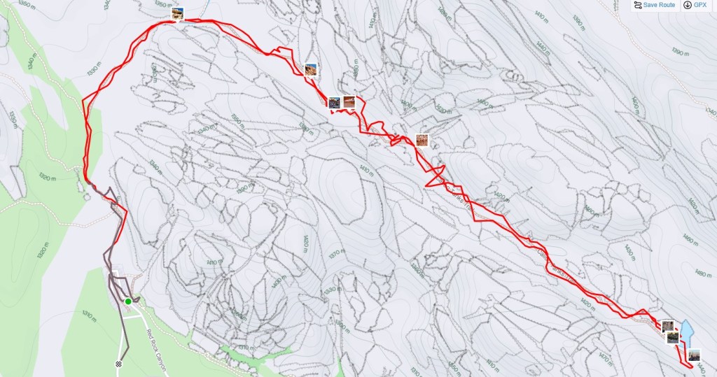 Once we entered the canyon – whoa! What fun! The colours and rock formations were absolutely amazing. This was my first time in the Nevada desert, and being up close and personal with these gorgeous red rocks. We were running around like little kids. That probably accounts for the extra distance.