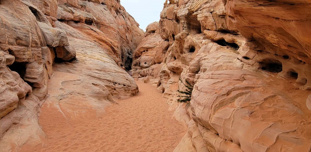 After hiking back to the campervan, we grabbed a quick bite and some more water. As the park was getting very busy, we didn’t want to give up our parking spot. The line of traffic heading towards White Dome was long. We checked the map, and decided to hike across to the White Domes trail. This was ideal as A) no one else was here, and B) the cars were lined up down the road, so we possibly hiked less than if we drove.