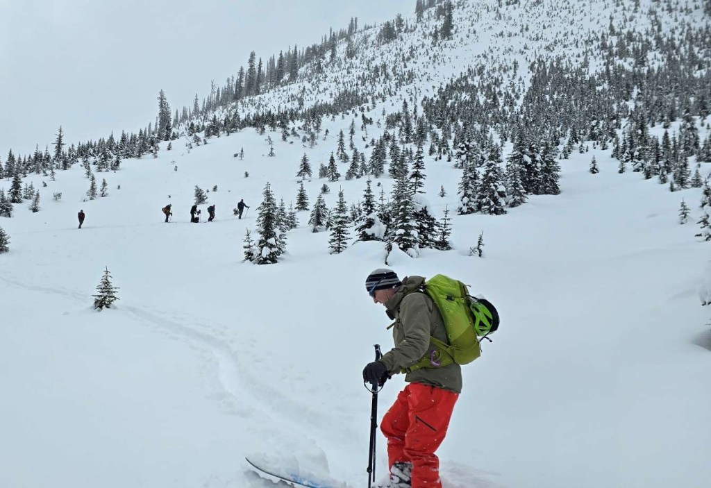 Two days after the storm broke, we had enough confidence in the snow pack to venture up Paradise Ridge. This was dealt with very seriously. First, we had a very good morning meeting, where we discussed all the hazards. Not everyone was keen to ski the alpine, and they elected to ski trees below the lodge. They had an amazing day.