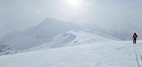 On the ridge. Despite the numerous and large cornices, it was easy to stay far away from them on the wide ridge.