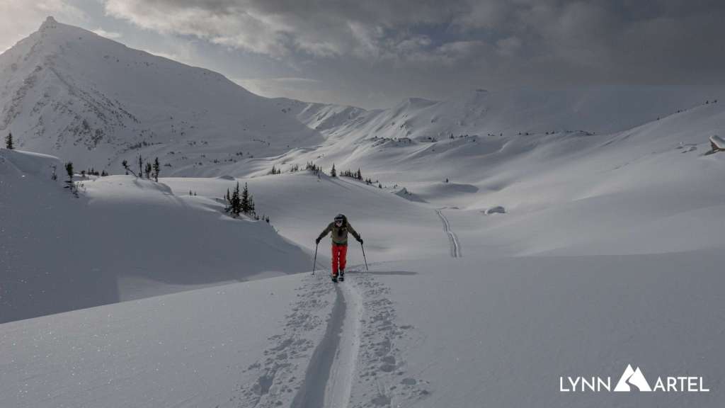 At the bottom of Back Door, Front Door and Waterfall is the necessary ski across Carrot Lake to access the lower runs, but also the uptrack back to the Lodge. Thank you to Lynn Martel for capturing this mundane but necessary part of backcountry skiing.
