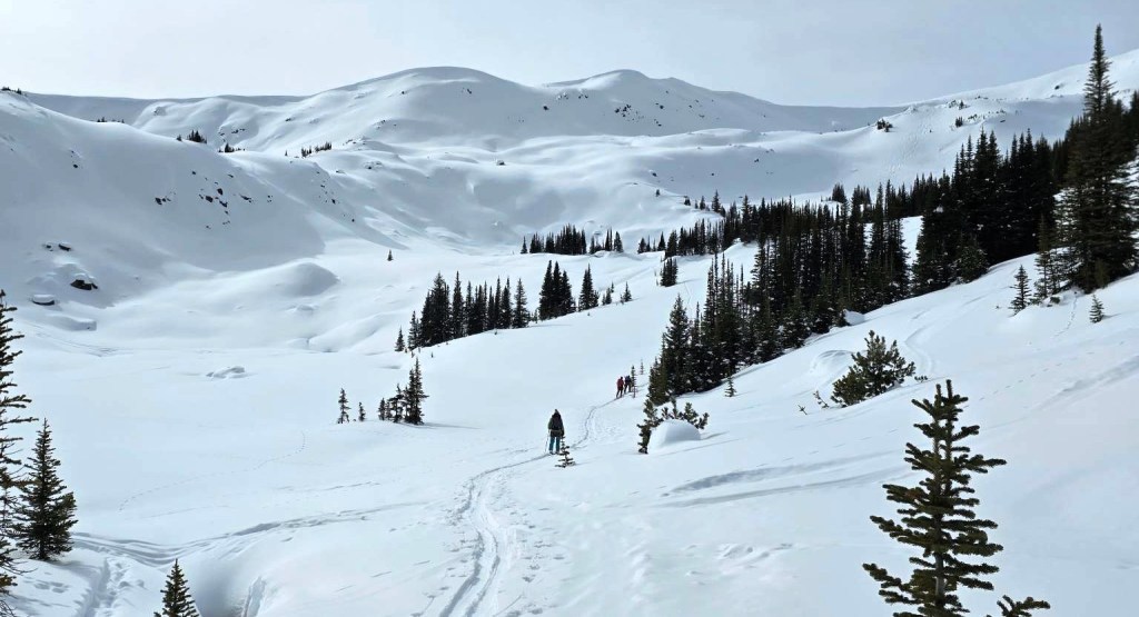 Elevator Shaft is directly in front, middle of the photo. We did not ski from the ridge due to conditions, but the lower run was amazing. I’d love to be here in better avalanche conditions and ski the heck out of all those slopes. For our one day of good weather / conditions, we ascended Paradise Ridge to the far right – at the lowest point. In good conditions, many people will ascend the ramp on the left side of the photo. Our custodian said he didn’t like that route, even on a good day, so I was happy with our more mellow track.
