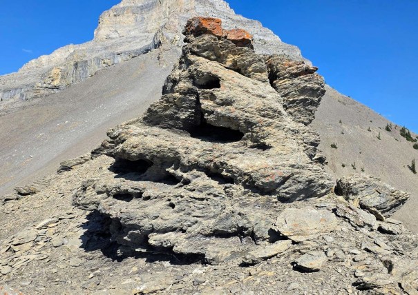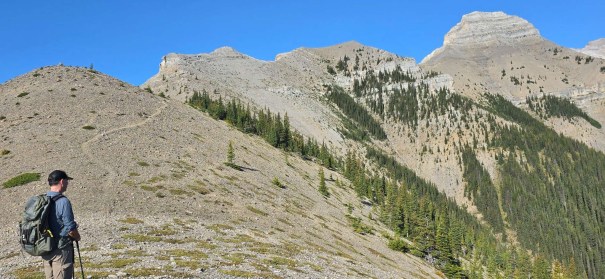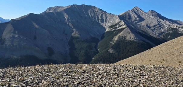 Drive to the end of Highway 546 (Sheep River Road) to the Junction Falls trail head. Park on the lower level. Walk to the upper level, past the gate, and up the old road. Take the first turn off, and follow a narrower track that switchbacks up. Make a hard left turn to follow the pretty good trail through the forest and up to the open ridge. Once on the scree slope, follow the ridge line to the base of the false summit. We skirted across the east face, finding a fairly good trail and the all important cairn. Once across, continue on the ridge, dodging and weaving the big blocks left or right as the terrain dictates. For the final push to the summit, Nugara suggests taking the scree to the right, but we missed that note. Instead, we scrambled up onto the ridge head on. At the summit, we saw the beaten in screen trail and took that down, saving time and avoiding down climbs. Otherwise, we retraced out steps back down.