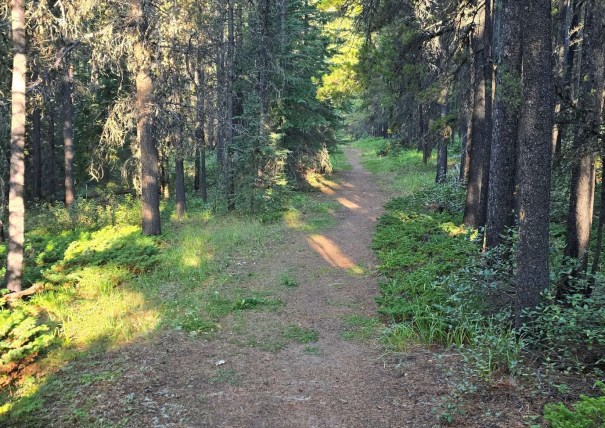Drive the Sheep River Road (Highway 546) to the very end at Junction Falls. Avoid parking at the top of the loop, or you might be trapped by some very large equestrian trucks and trailers. Park down below, then walk back up to the gate. Almost immediately, we took the right hand fork and hiked a slightly narrower track. We stayed on the road until we hit the up track in the forest, slightly less than 1.5 km from the lower parking lot.