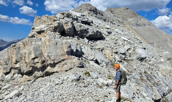 The scree ridge lasts for a long time. There are several sections that look tricky, but are by-passed on the right side.
