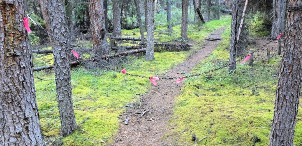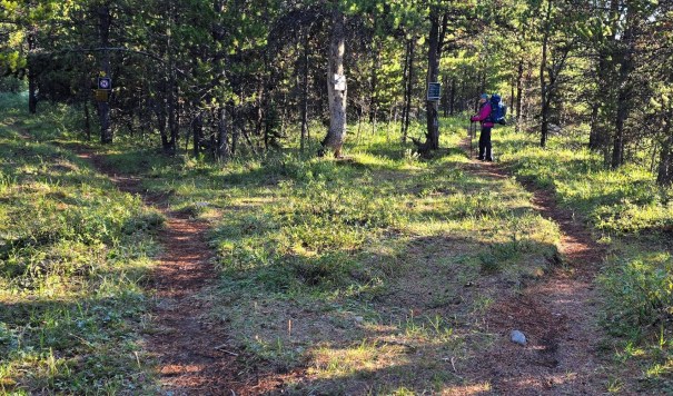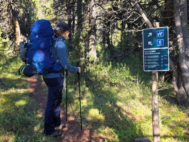 From the Four Points Campground, we turned left (east) on the wide, flat trail. After only 50 m, we passed the turn-off for the Great Divide Trail to Jonas Pass and Jonas Shoulder. We stayed right to keep on the river trail.