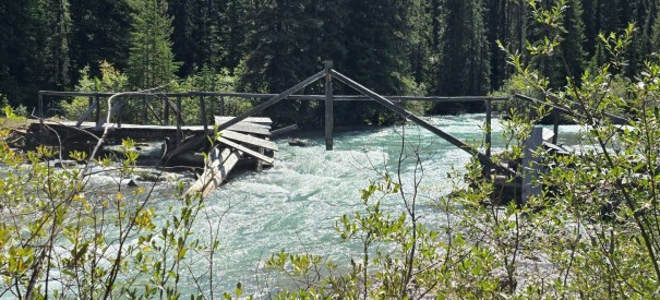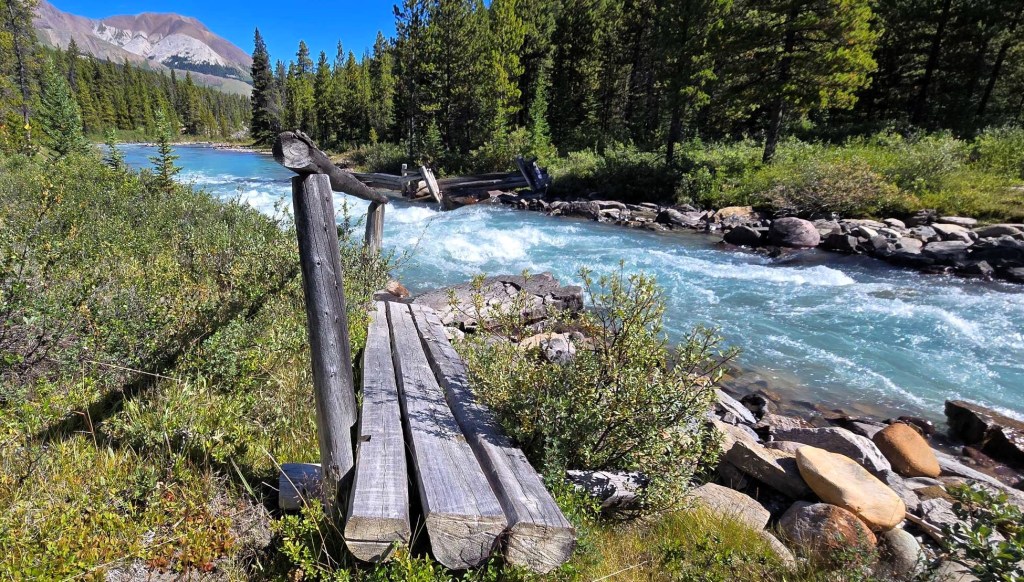At 17.6 km, we saw the second Brazeau River bridge that was devastated. While both ends were intact, the middle was completely gone. This is the normal passage across the river for the next morning. No matter, we would continue on and see what awaited us at the campground.