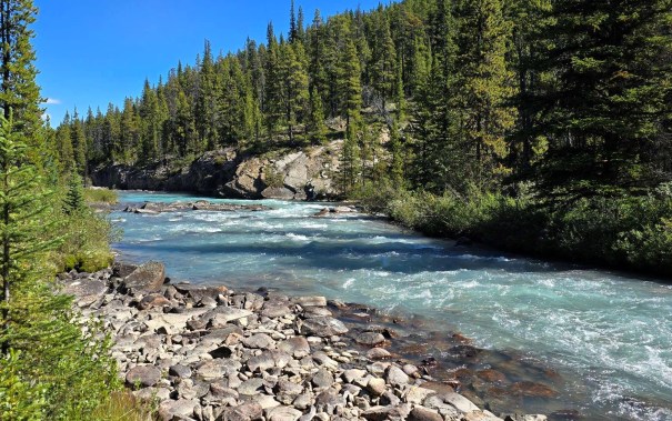 From the Four Points campground, we turned left and followed the trail. At 50 m, we kept right to stay on the Brazeau River valley trail. After 15 km of a mild but steady descent, we crossed the Brazeau River on a narrow bridge. Hiked another 3 km to the Brazeau Lake campground, regaining about 1/2 of the lost elevation for the day.