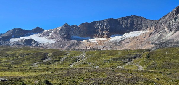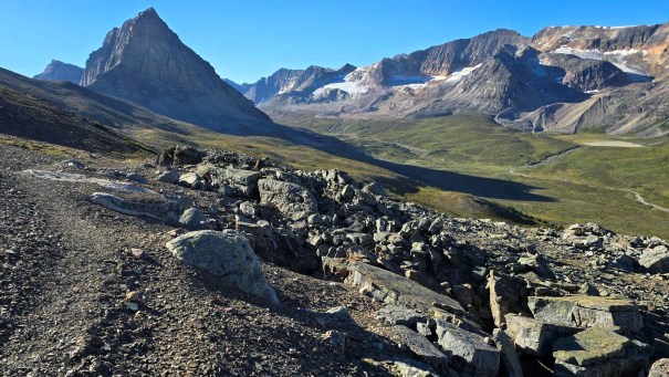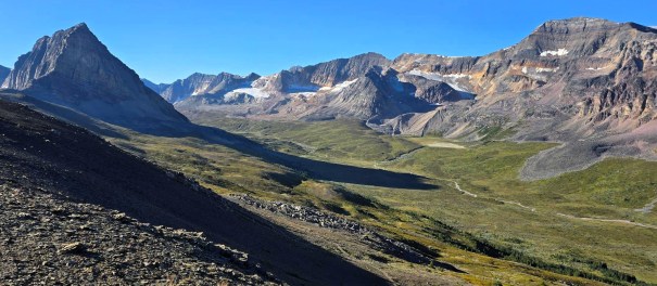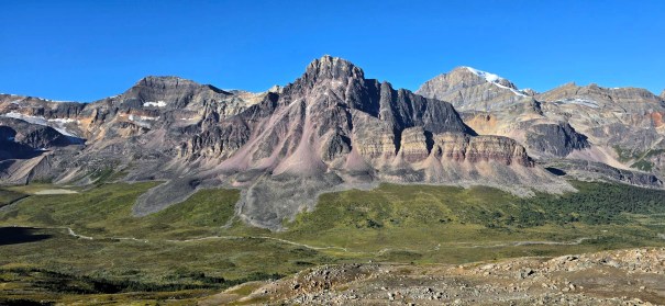 All too soon, we had to hike down the steep trail to enter the wide Jonas Pass valley. The Sunwapta ‘range’ was on our right, with several small glaciers and interesting rock formations to keep us well entertained. On our left we had “Le Grand Chateau” – the mountain we named the day before. Who knew we’d be seeing this beauty from all sides. The scrambler in me was looking for routes up all these peaks.