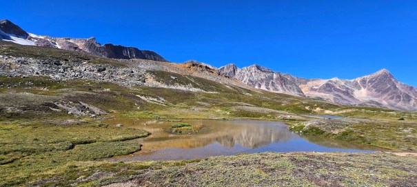 The hike up was beautiful, and Erin and I fully enjoyed the amazing scenery. We were again in the wide Poboktan Pass plateau we hiked through yesterday, but the other side. The ground was wet and marshy. This might be from a really wet year, but other backpackers said it’s always wet and mucky through there.