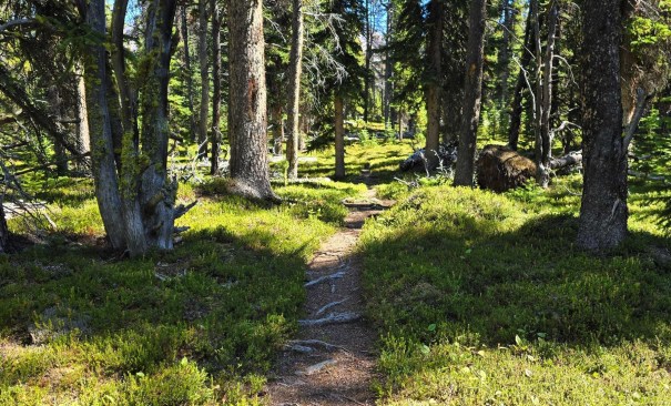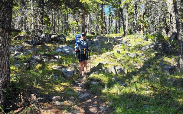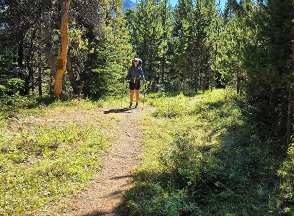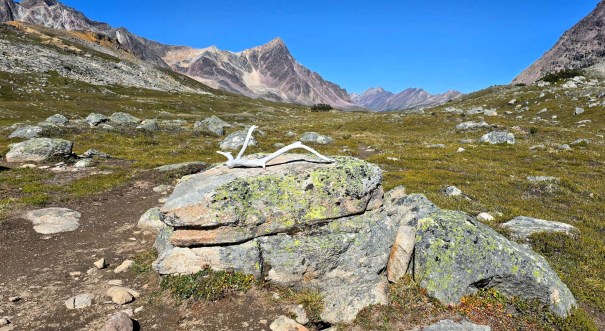 Once we got off the steepest part of the descent, the trail leveled out. We hiked to Jonas Pass, which was not marked other than a big rock with some antlers. It was 11:30 am, and a little early for lunch, but we took the opportunity to dry out the tents, and air out the sleeping bags. Four Points campground is not bright and sunny, and we wanted everything as dry as possible.