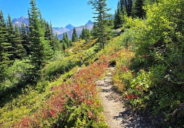 From the campsite, between the tables and the tent area, look for the yellow diamond. Follow this trail to connect with the Jonas Shoulder trail heading SSE. Steadily gain elevation up to Jonas Shoulder. Freak out about the views and take a million photos. Descend the other side of Jonas Shoulder into the wide valley. Gain minimal elevation until Jonas Pass. Keep hiking, slowly losing elevation until about the 16 km mark. Hike steep descent into the forest. At the T intersection, turn right. The Four Points Campground is about 50 m on the right.