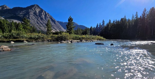 Unlike our first day in Four Points when we were rushing to avoid the rain, this was a completely different experience. The sun was shinning, and it was time to hit the river. The best spots are slightly down stream from the campground, heading towards Brazeau Lake. There are several large rocks, and lots of places to wade in without fully committing to the fast water.