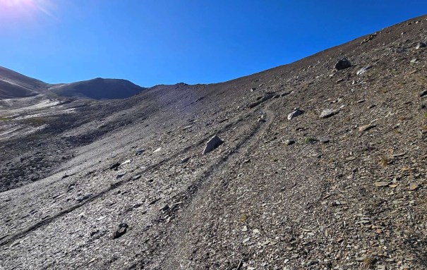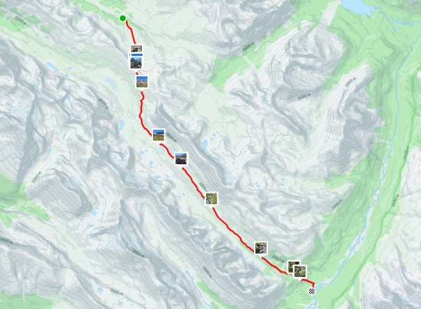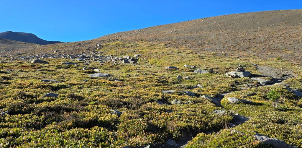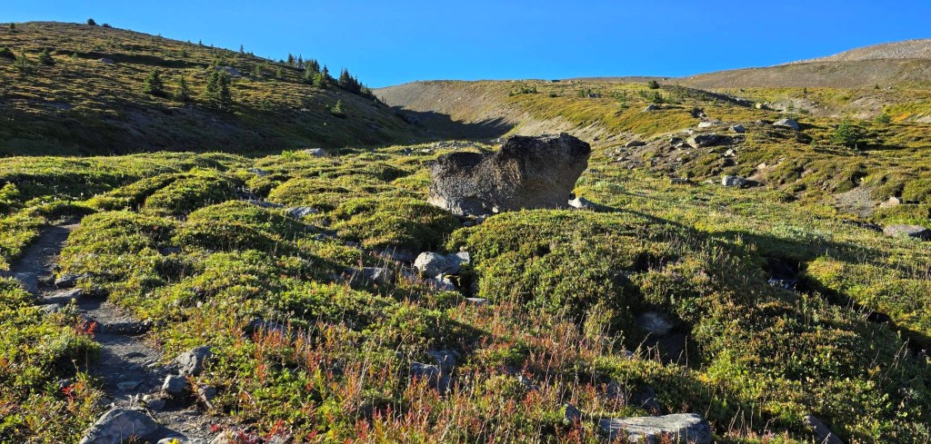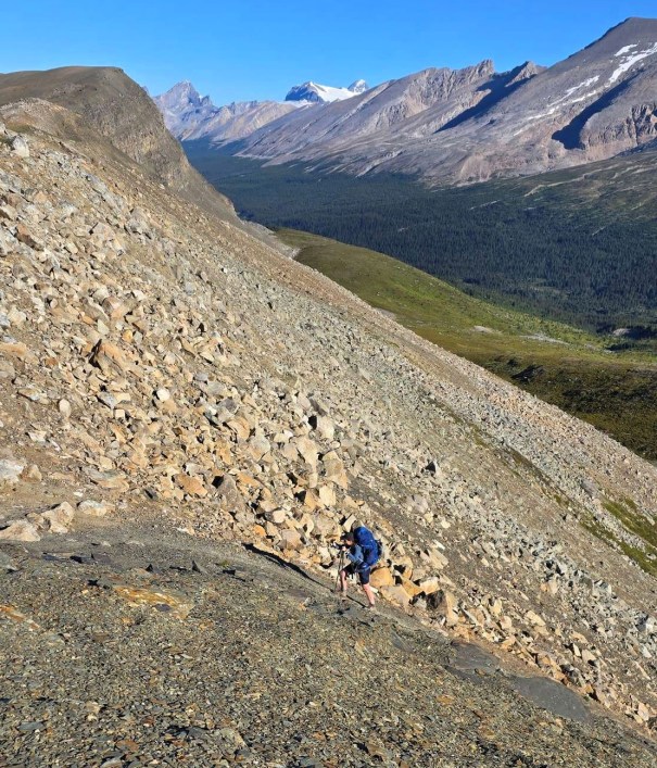 We loved the scenery, and saw the gorgeous hills and mountains from yesterday. The steep ascent starts at the moraine. We both agreed that one more switchback was needed to maintain that perfect Parks Canada elevation grade.